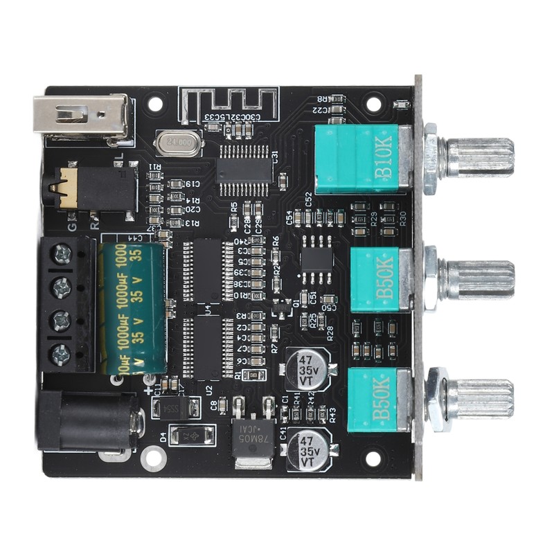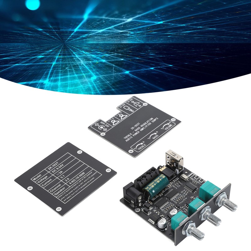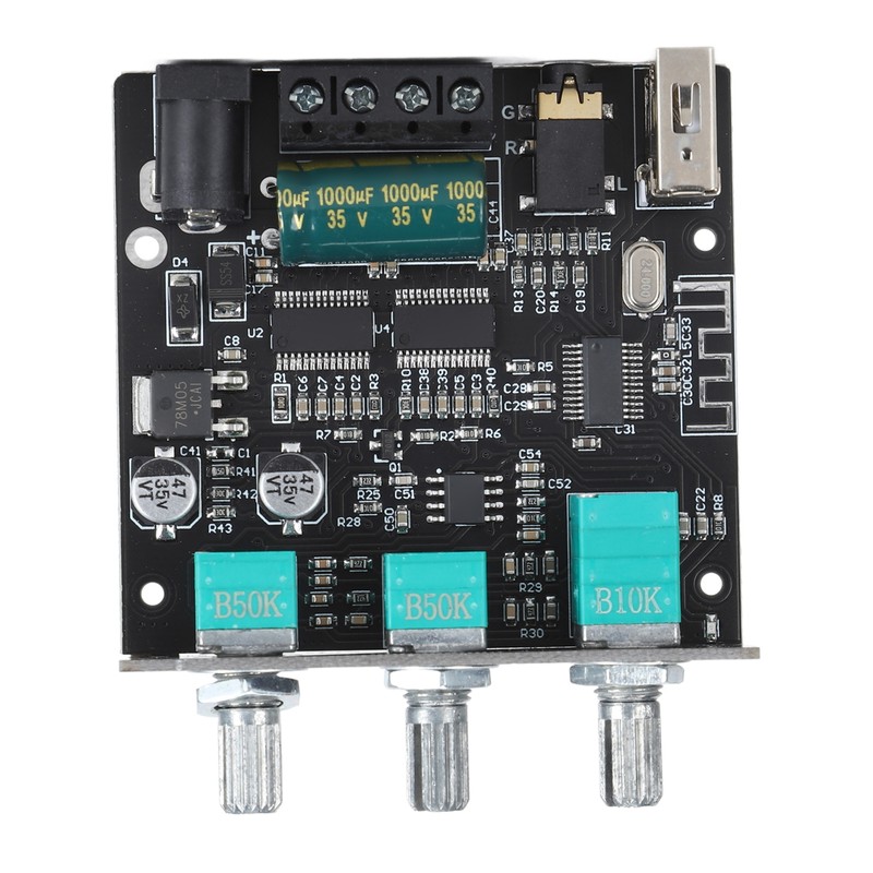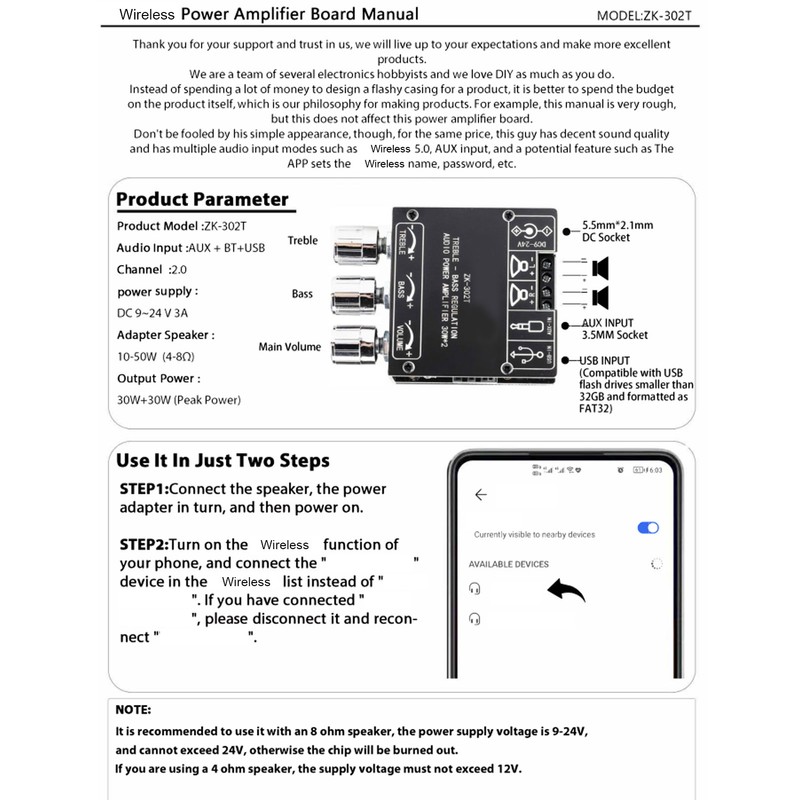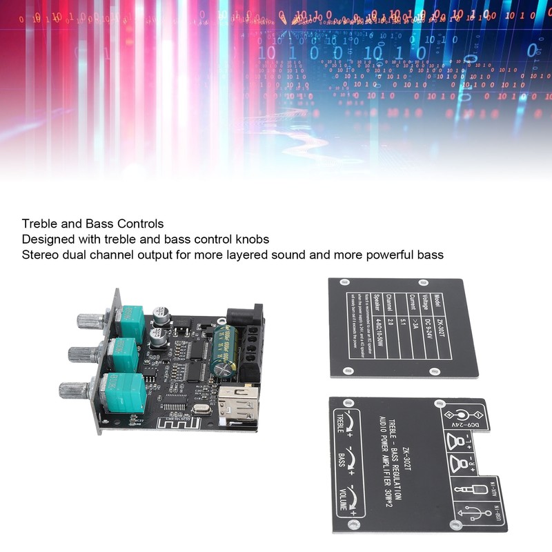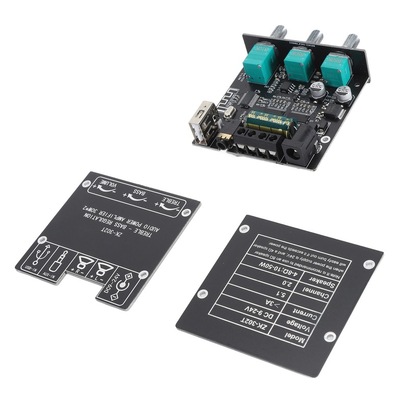 1、HIGH POWER AND WIDE VOLTAGE: ZK 302T as a compact 2.0 channel bluetooth amplifier board with small size and many functions. Its peak power (PMPO) is up to 30W plus 30W and 9‑24V wide voltage input. 2、MULTIPLE INPUT MODES: Input modes include Bluetooth, AUX and USB sound card, USB flash drive modes, which can be connected to playback devices such as cell phones, tablets, CD players, computers, USB flash drives and more. 3、TREBLE AND BASS CONTROLS: Bluetooth power amplifier board is designed with control knobs for treble and bass, stereo dual channel output for a more layered sound and more powerful bass. 4、APP FUNCTION: By downloading the dedicated APP, you can make in depth settings for the amp board through the mobile APP, such as customizing the bluetooth name, setting the bluetooth passcode, turning on, off the prompt sound and so on. 5、APP FUNCTION FOR ANDROID PHONES ONLY: At present, the APP function is only applicable to for Android cell phones, if your cell phone is not an for Android phone, you will not be able to use the APP function.