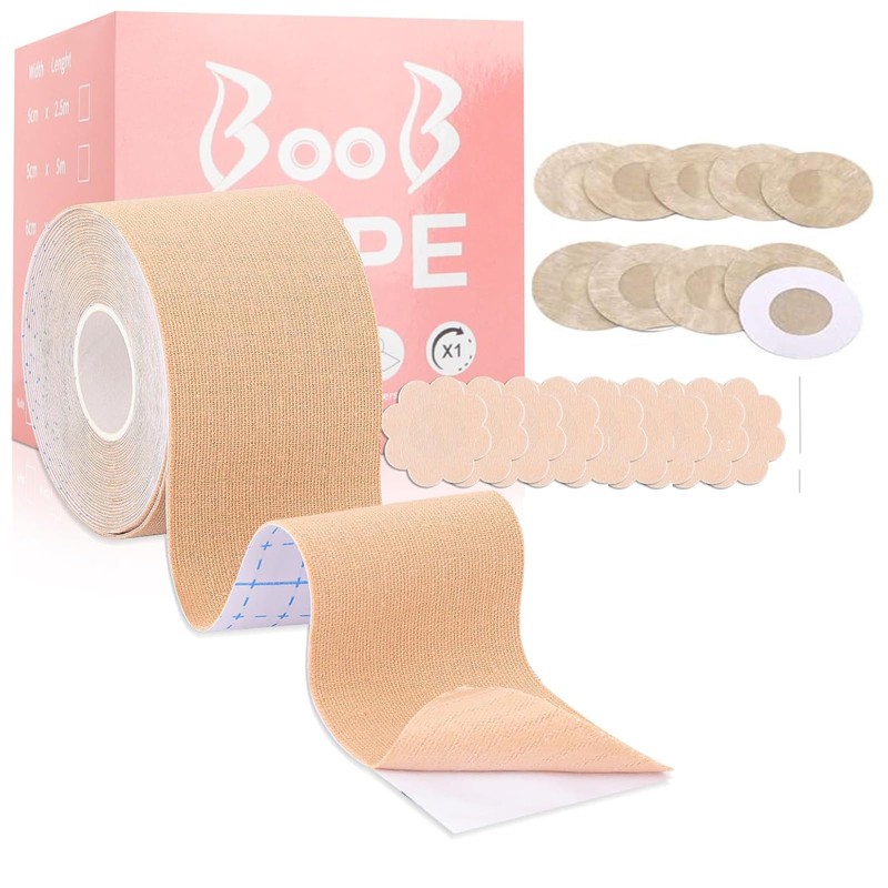 - 【Wide Application Boobytape】 Perfect boobytape for backless/strapless dresses, t-shirts, halter tops, wedding gowns, sports bras, swimsuits. Friendly to A-E cups, the bra tape will lift and push up even the heaviest breasts to achieve the boob shape you want.