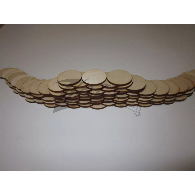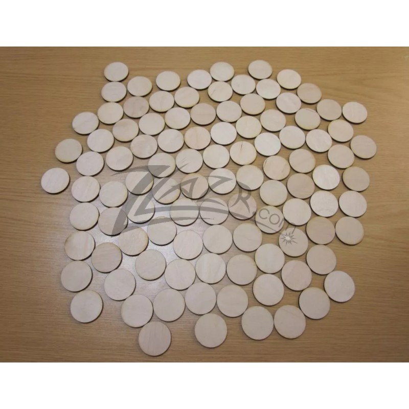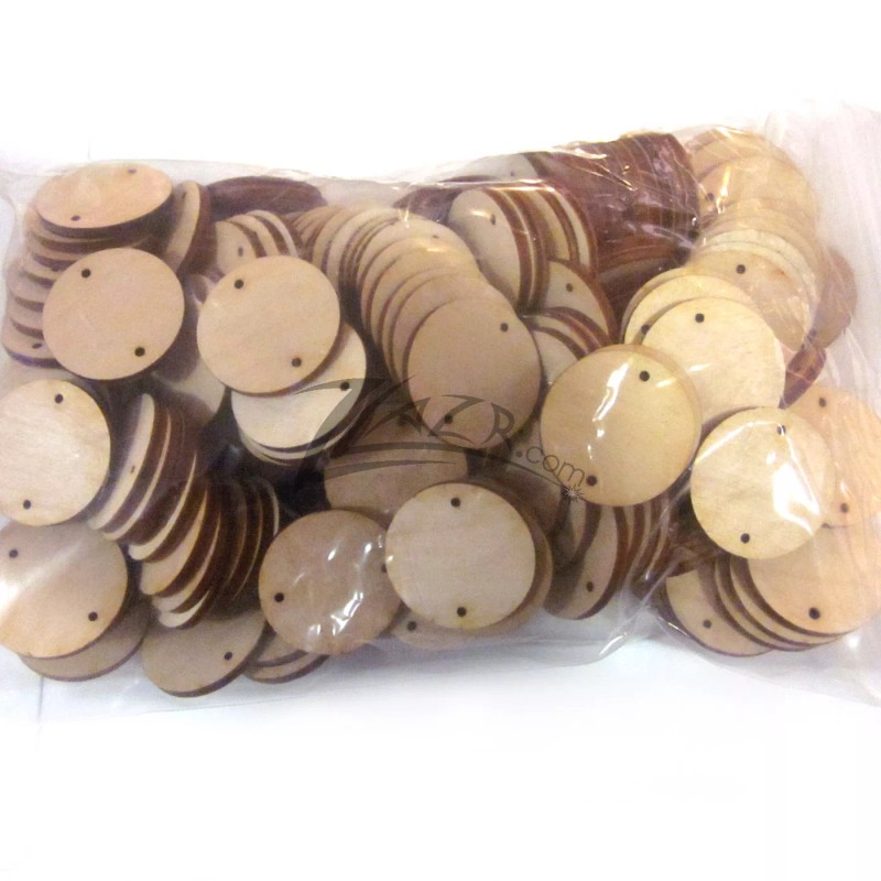 Laser cut wooden circle disc. Includes 50 circle pieces: 1" diameter at 1/8" thickness (approx.) with 2 holes on each disc (top and bottom). These circles are made from a great sturdy real hard plywood material. These are great for adult or kids craft projects, games, scrapbooking or even drawing. They are an unfinished wood and are easy to paint.