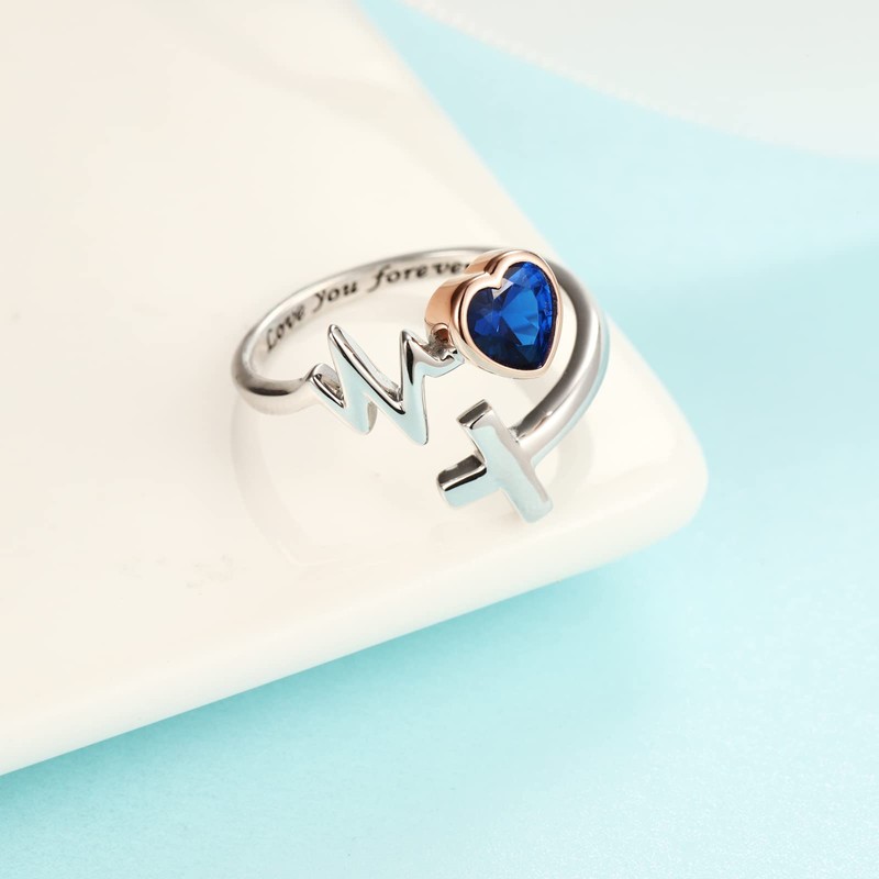 - ❤Heartbeat Jewelry 925 Sterling Silver Inlaid Aquamarine Cubic Zirconia Rings Paramedics Cross Adjustable Rings for Nurse Doctor Medical Students Inspirational Jewelry Gifts for Women