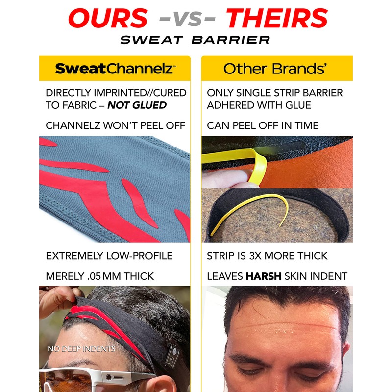 - 【 ANTI-SLIP GRIP SEAL 】 – Our low-profile, staggered SweatChannelz are made with a high tackiness to grip-seal to your skin and hold the headband in place during any rigorous activity. At merely 0.5mm thick, these barriers WON’T leave uncomfortably harsh skin indents across your forehead like other brands do.