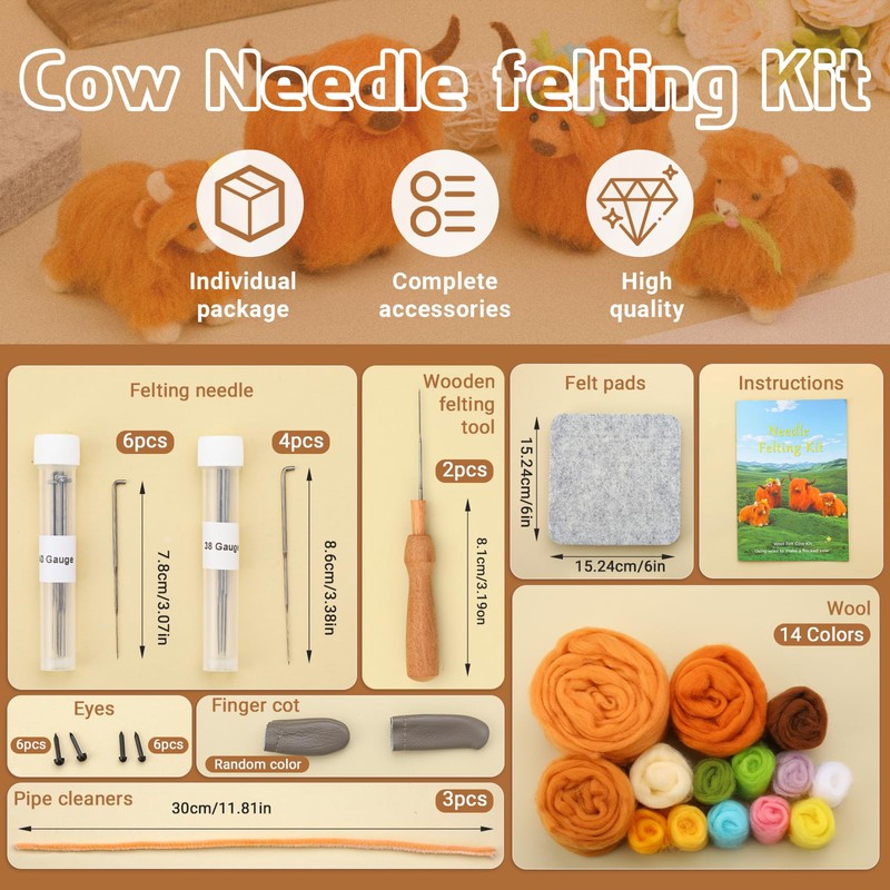 Zlulary Needle Felting Kit, Felting Kit, Cow Needle Felting Kit Wool Felting Kit for Beginner with Felting Supplies Includes Wool Roving, Felting Pad, Felting Needles and Instruction | Zlulary