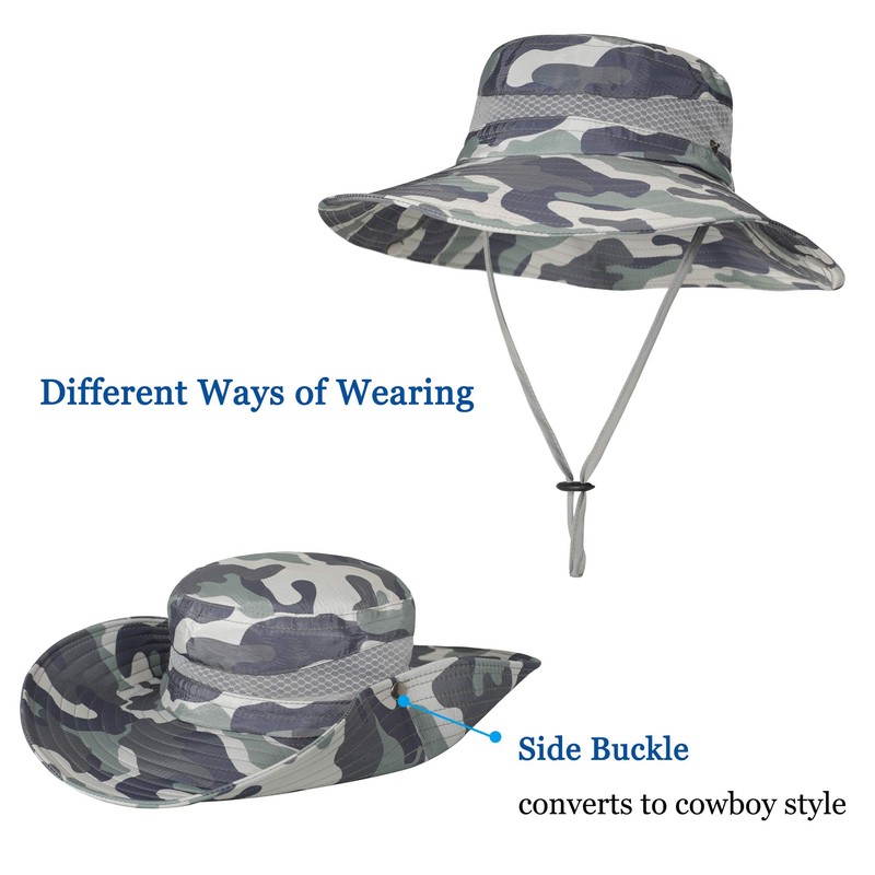 - Military style camouflage outdoor hat. Easy to fold and carry, it is ideal for camping, hiking, travel, gardening, fishing, safari and beaches.