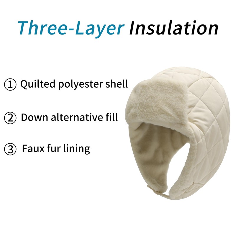 ZLYC Women Fleece Lined Winter Hat Windproof Synthetic Down Earflap Beanie Snow Cap, Solid Cream White