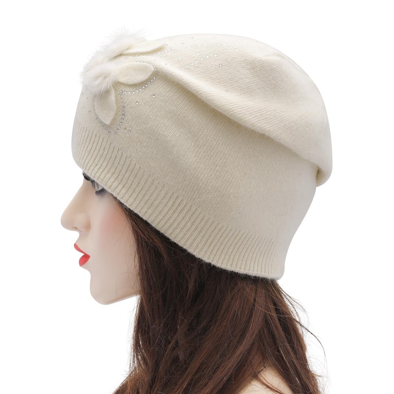 ZLYC Women Floral Slouchy Beanie Hat Double Layer Winter Knit Skull Cap, Three Small Pom Flowers White