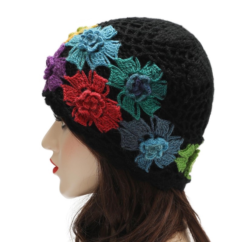 ZLYC Women's Winter Vintage Wool Knitted Beanie Bowler Hat, Colourful flowers black