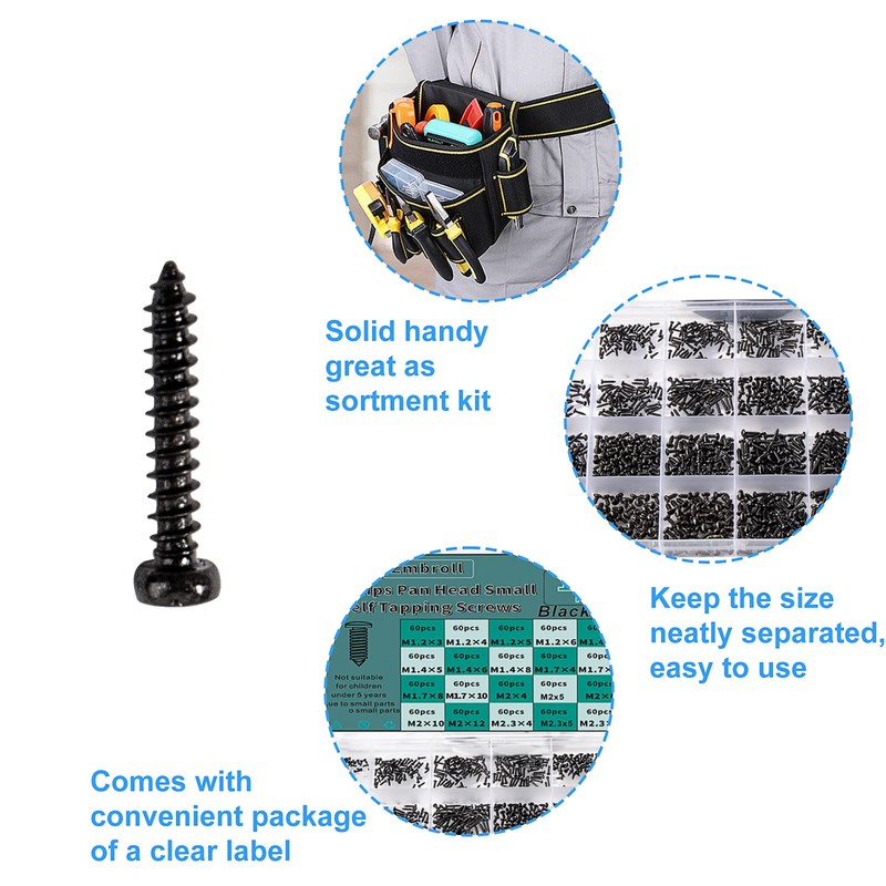 - Package includes: 1440 pcs (+/-2%) small screws, each size is 60 pcs black screws, each size is M 1.2 x 3, M 1.2 x 4, M 1.2 x 5, M 1.4 x 6, M 1.4 x 3, M 1.4 x 4, M 1.4 x 5, M 1.5 x 6, M 1.40 x 8, M 1.7 x 4, M 2.7 x 5, M 2.75 x 8, M 1.7 x 10, M 2 x 4, M 2 x 5, M 2 x 6, M 2 x 8, M 2 x 10, M 2 x 12, M 2.3 x 4