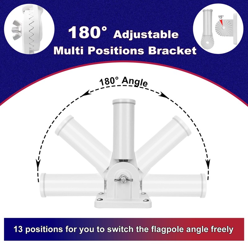 - 180° Adjustable MultiPositions Bracket: High-strength aluminum alloy flagpole stand with 13 positions for you to switch the flagpole angle freely.The upgraded flagpole rings allow for a 360° rotation, ensuring that the flag can freely flutter in the air without becoming entangled.