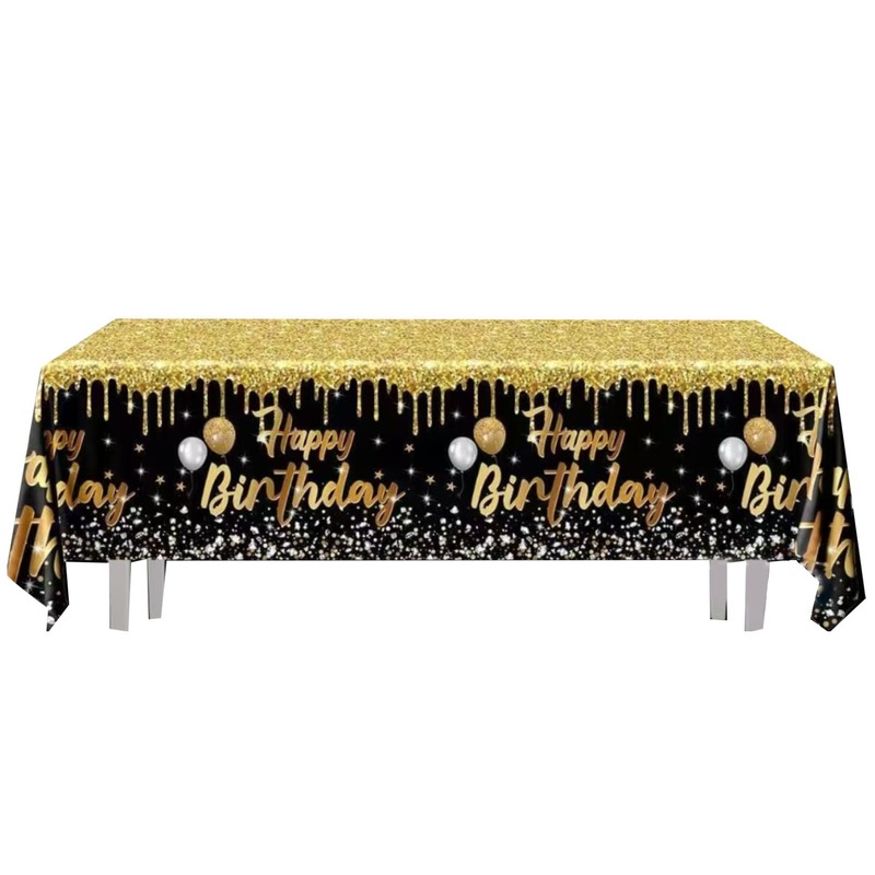 - [Black Gold Birthday Table Cloth] Black gold happy birthday tablecloth is made of high quality polyester fabric with fine workmanship, waterproof, durable, fade resistant and keeps its shape and does not fade after rain, ideal for indoor and outdoor use.