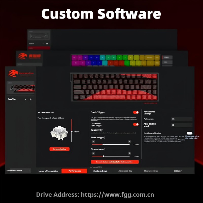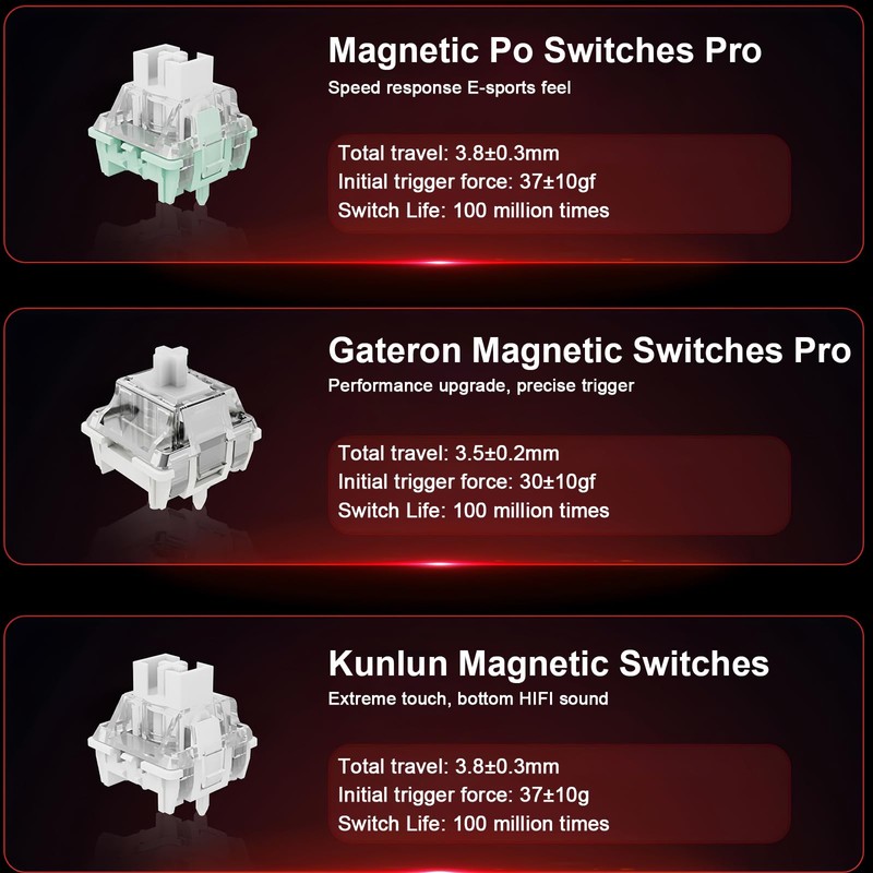- Hall Effect Adjustable Magnetic Switches: Equipped with high performance hall effect magnetic switches, offering ultra-accurate typing experiences adjustable in 0.02mm. From 0.08mm to 3.5mm customizable trigger travel. In addition, the press sensitive and reset sensitive can be set individually through the software to match the key press habits of different people for different occasions