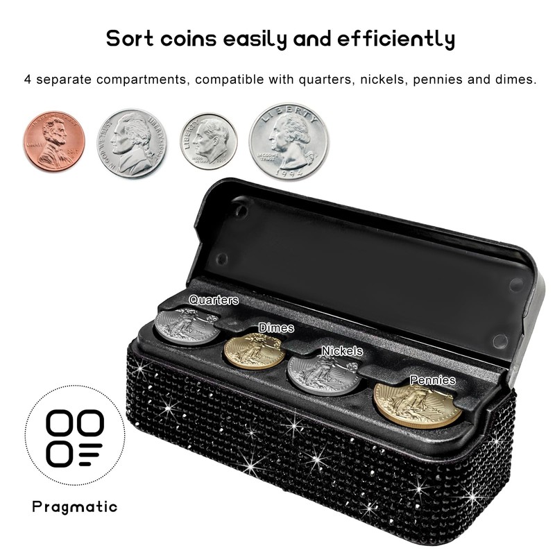 ZNDAW Bling Coin Holder for Car, Rhinestone Crystal Car Coin Change Organizer with 4 Compartment, Sparkly Coin Storage Case Money Dispenser Universal for Most Vehicles Home Office (Black)