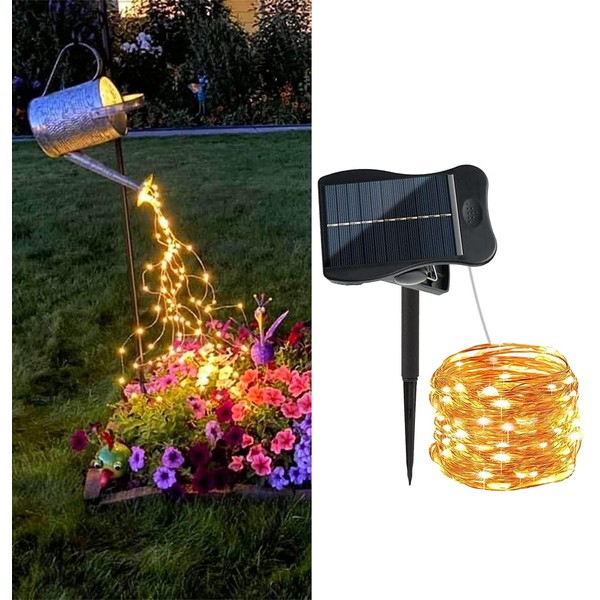 **Color:Warm White-Solar powered Hanging Lights** Glowing Watering Can with Fairy Lights (Watering Can not included): feed the strings of fairy lights through shower head one by one, then bent and shape the flexible copper wire like flowing water. Pick a special spot in your garden or yard to hang watering can with lights that look like it is pouring water. It is romantic and fairy. Check out Product Description below for the full directions. **Warm Tips:** \- Take off the plastic on solar panel thenmake sure it face to sun directly and a totally dark environment can make thelights work more perfectly. \- How to check the solar panel is ON? ——Leave the unit in the sun for an hour and then cover the complete solar panel.If the lights come on, the button is in the on position. If NOT, push in thebutton once again and put the unit in the sun for another hour. Cover the solarpanel again and it should light up it should light up. **Specifications:** *Length of each string: 6.6ft *Number of strings: 10 strings *LED Quantity: 200 LEDs *Mode: 8 Modes (in wave/sequential/slo Glo/ flash/slow fade/ Twinkle/steady) *Wire Color: Copper Wire *LED Color: Warm White *Switch Type: ON/OFF switch *Length between 2 LEDs: 3.93in *Waterproof: YES, IP65. *Powered by solar panel *Solar panel voltage: 2V *Working time:More than 12 hours after fully charging **What's in the Box?** 1 x Christmas Decorations Led String Lights. 1x Clip solar panel(Included poles) 1 x User Manual **Please feel free to contact us if you have any questions.Thank you.**