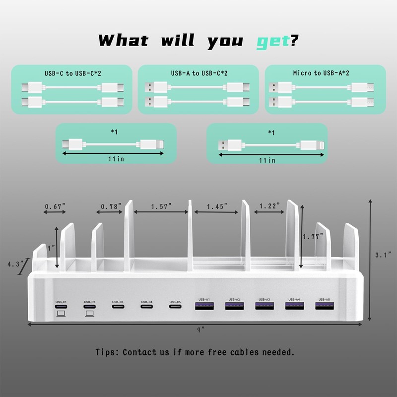- What You Get: 1 Zobirez Charging Station, 1 Power Cord, and an 8-Pack of Short Mixed Charging Cables: 2 for iPhone & iPad, 2 Type C, 2 USB C, and 2 Micro USB. Our USB C GaN charger station offers advanced protection features, including Flame Retardant, Over-Current, Over-Voltage, Overcharge, Overload, Overheat, and Short Circuit Protection, ensuring 100% safety for you and your devices. Plus, enjoy peace of mind with our friendly customer service.