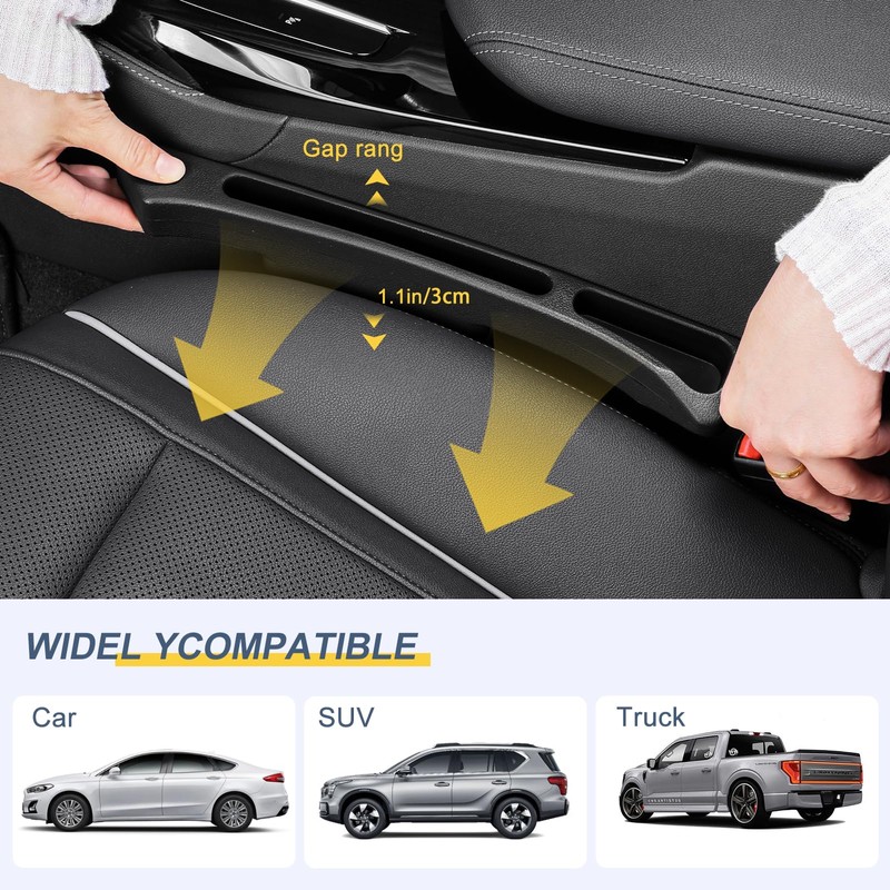 - Suitable for Universal car model. This multi-functional car seat gap filler is suitable for most cars, off-road vehicles, trucks, SUVs. Each package two pieces, one for the driver's side and one for the passenger's side. It includes a seat belt hole, which allows it to move with the seat without the function of the seat belt.