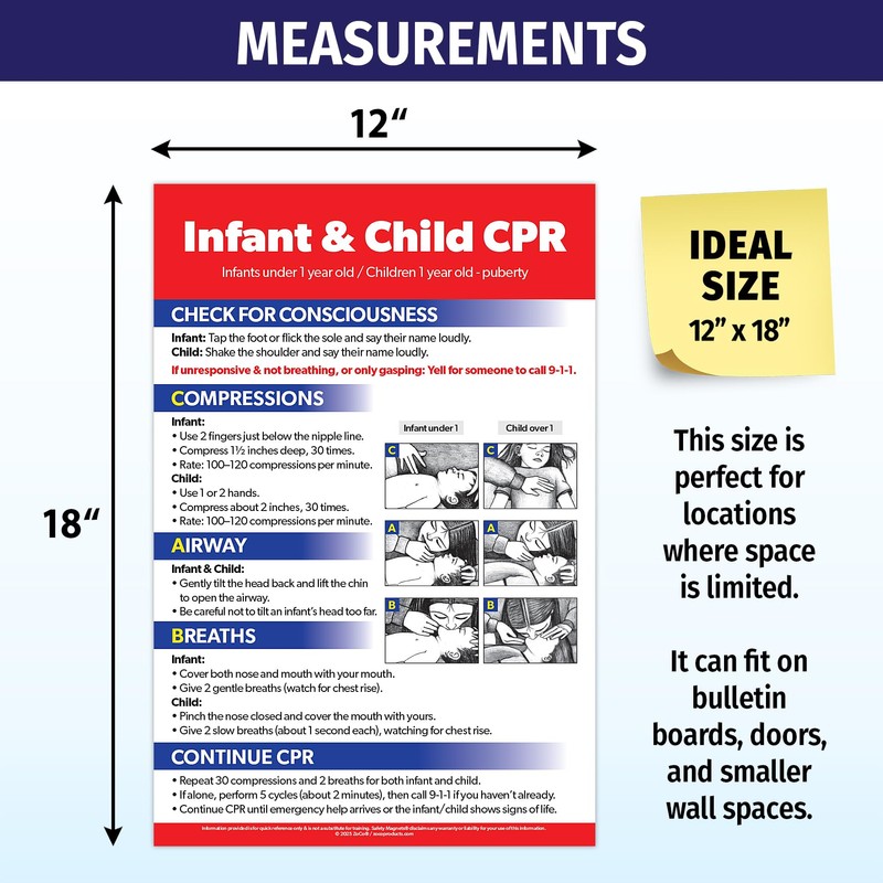 - 2 Pack: Infant & Child CPR Poster – Covers essential Infant and Child CPR steps in a clear, easy-to-follow format; a valuable addition to any first aid kit, classroom, or training space. Infant and Child Choking Poster – Clearly outlines how to respond to choking emergencies using age-appropriate techniques, including the Heimlich maneuver; a valuable addition to any CPR or first aid kit