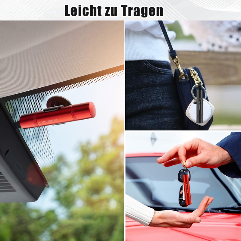 - Safety hammer set: you will receive 2 emergency hammer small car with adhesive holder (red and black), 2 emergency whistles (red and black), 2 carabiner hooks (red and black), 2 round test glass. 2 emergency hammers with belt cutter that you can share with your family. You can also have 1 safety hammer in the car and 1 safety hammer with you.