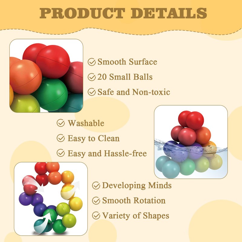 - đăSensory Toys for ChildrenăEducational fidget balls consists of 20 small rainbow coloured balls in 10 bright colours, each sphere is connected to each other in a special way, by twisting to get different form structure, novel and interesting to play.