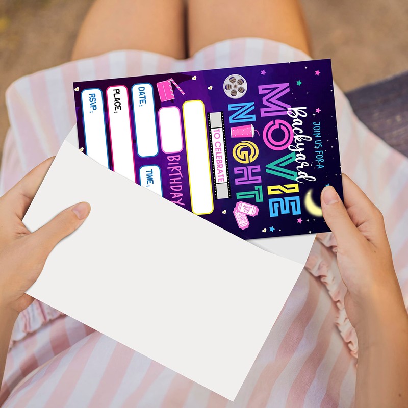 Zodvery Movie Night Birthday Party Invitations Cards - Backyard Movie Night Party Supplies for Kids, Boys or Girls - 20 Fill in Birthday Party Invitations and 20 Envelopes set/48