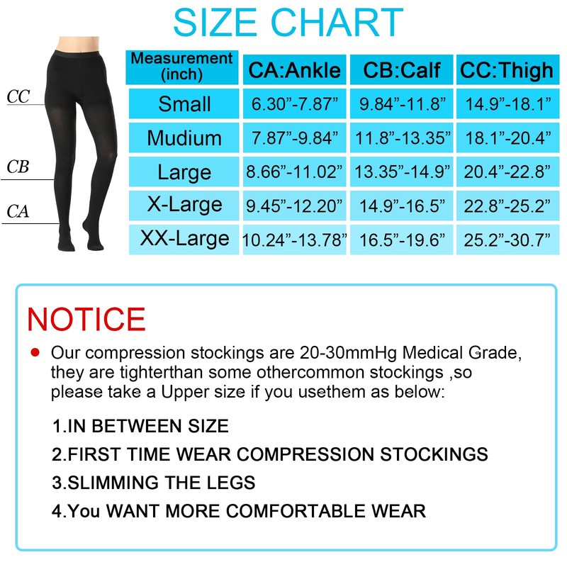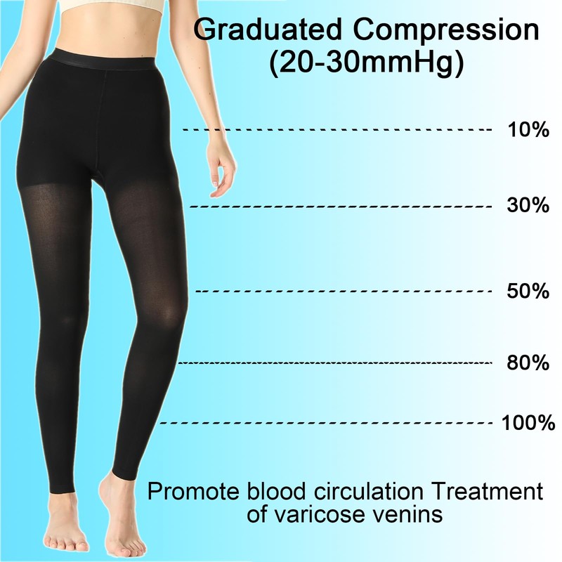 - MEDICAL EFFECT OF THE 20-30 mmHg COMPRESSION PANTYHOSE:Medical compression tights are formulated with gradient compression technology.we used two-way stretch design provides extra comfort and strong compression while re-energizing tired legs.help with leg swelling, spider and varicose veins, cellulitis, blood circulation, post phlebectomy, leg pain, venous insufficiency, blood clots, DVT and after sclerotherapy.provide relief from painful symptoms.