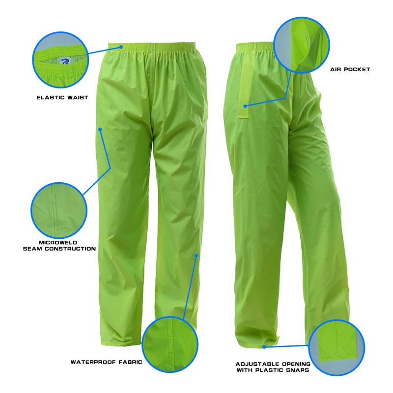 • Soft polyester outer shell with PVC backing, 100% waterproof rain gear will keep you dry and comfortable in the wettest weather.