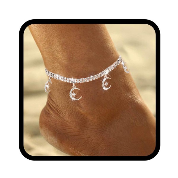 Zoestar Boho Rhinestone Anklet Silver Star Moon Anklet Crystal Anklet Jewelry for Women