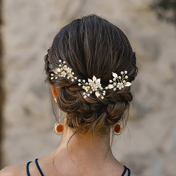 Zoestar Bride Wedding Hair Pins Pearl Headpiece Leaf Beads Bridal Hair Accessories for Women and Girls(Pack of 3) (Gold)