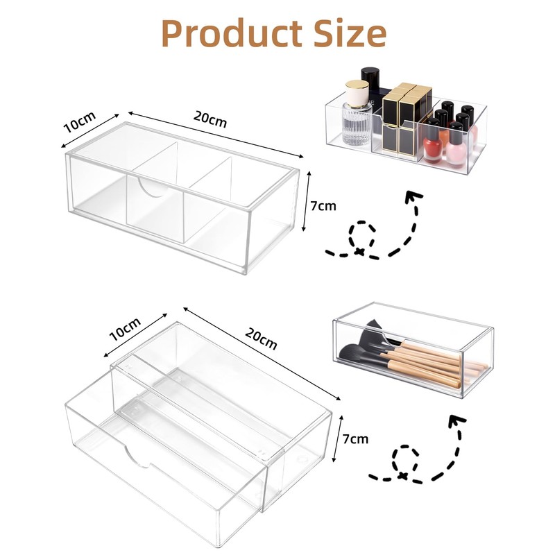 - Stabil stapelbar: Unser make up organizer hat die Maße 20 cm × 10 cm × 7 cm und besteht aus 2 Teilen, die aufgrund ihrer einheitlichen Größe beliebig gestapelt werden können, was die Aufbewahrung und den Transport erleichtert. Es eignet sich hervorragend für die Aufbewahrung auf dem Schminktisch und bietet ausreichend Platz für all Ihre Kosmetika, Make-up-Pinsel und Schmuckstücke.