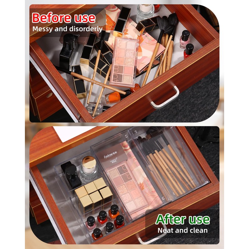 - Ausziehbares Schubladendesign: Dieses schmink organizer verfügt über ein Schubladendesign, sodass Sie mit einem leichten Zug auf Ihre benötigten Kosmetika usw. zugreifen können, was den Komfort erhöht. Eine der Aufbewahrungsboxen ist außerdem mit Trennwänden ausgestattet, die sich für die Aufbewahrung verschiedener kleiner Gegenstände eignen. Die Position der Trennwände kann je nach Bedarf verschoben werden.