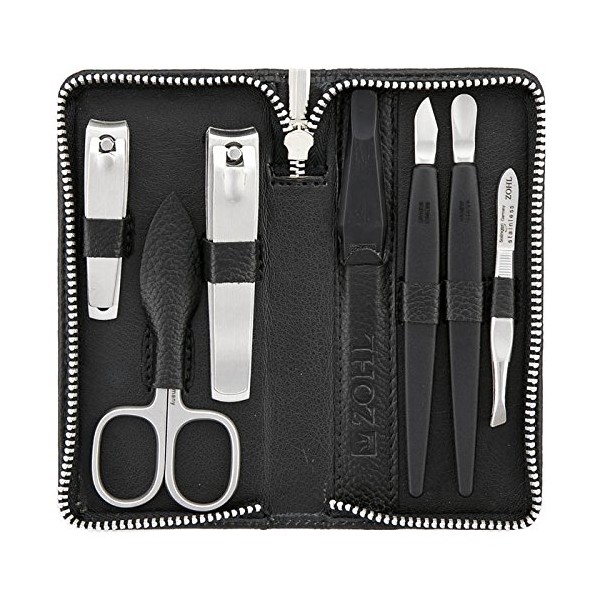 - HIGH QUALITY STAINLESS STEEL MANICURE SET MADE IN GERMANY: ZOHL manicure set is crafted from fine rostfrei steel with perfectly sharpened edge that trims nails smoothly and easily. The set includes high quality German nail clippers for fingernails and toenails, manicure scisssors, nail file , cuticle pusher, cuticle trimmer, and eyebrow tweezers.
