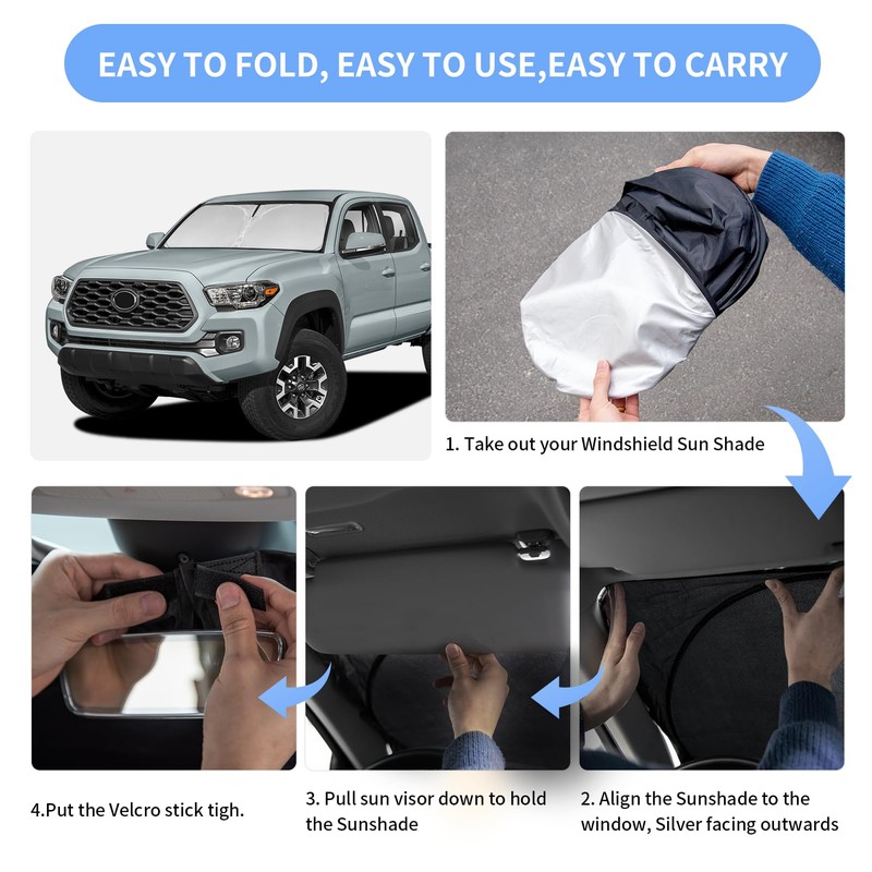 - UV ProtectionThe foldable windshield sun shade is made of high quality polyethylene (HDPE) microfiber,Silver reflective surface can reflect 99% of ultraviolet rays--great sun reflector.blocks heat & sun. Keeps your car cool.
