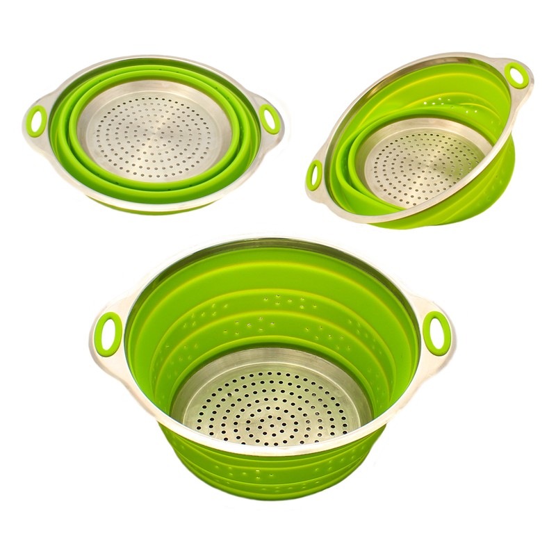 • New space saving design. These colanders are generously sized and yet folds flat to no less than an inch high. Easy to store in tight cupboards and limited space.