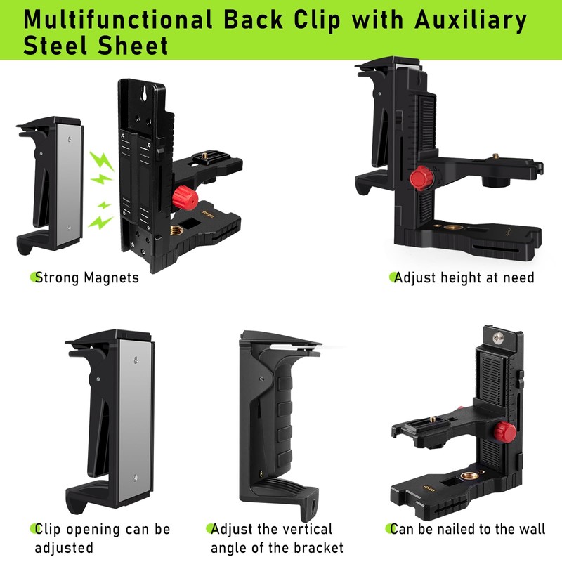 - Multiple installation methods: 1/4"-20 and 5/8"-11 female threads can be connected to a tripod or laser rod. Magnetic back clip: Attach to the metal surface with a Magnetic back clip. Screw holes: hooks, nails, etc. can be used to fix them on the wall. Threading groove: You can use ropes, cable ties and other objects to bind and fix with other objects through this groove.