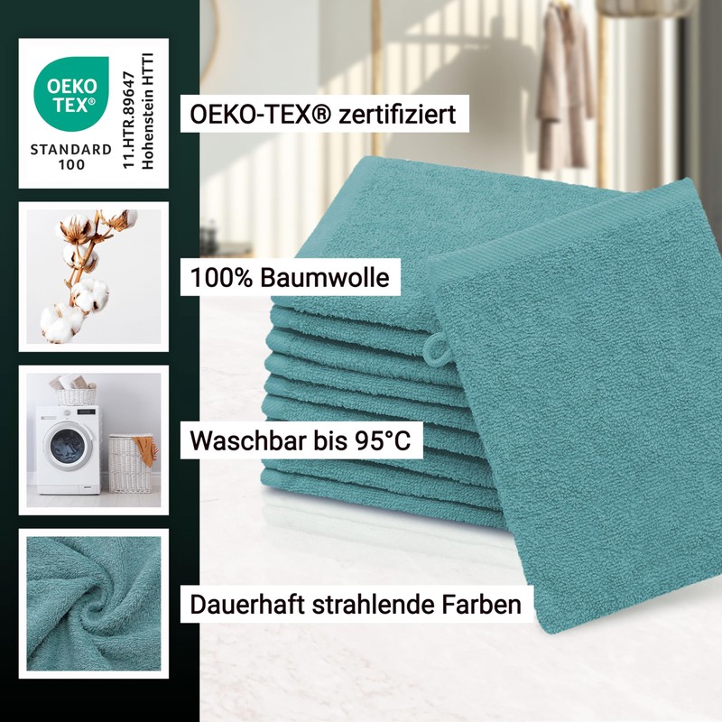 - With a size of approx. 16 x 21 cm, the wash mitts, which have been tested for harmful substances according to Oeko-Tex Standard 100 11. HTR.89647 Hohenstein HTTI, fit perfectly in your hand and are pleasantly soft to your skin