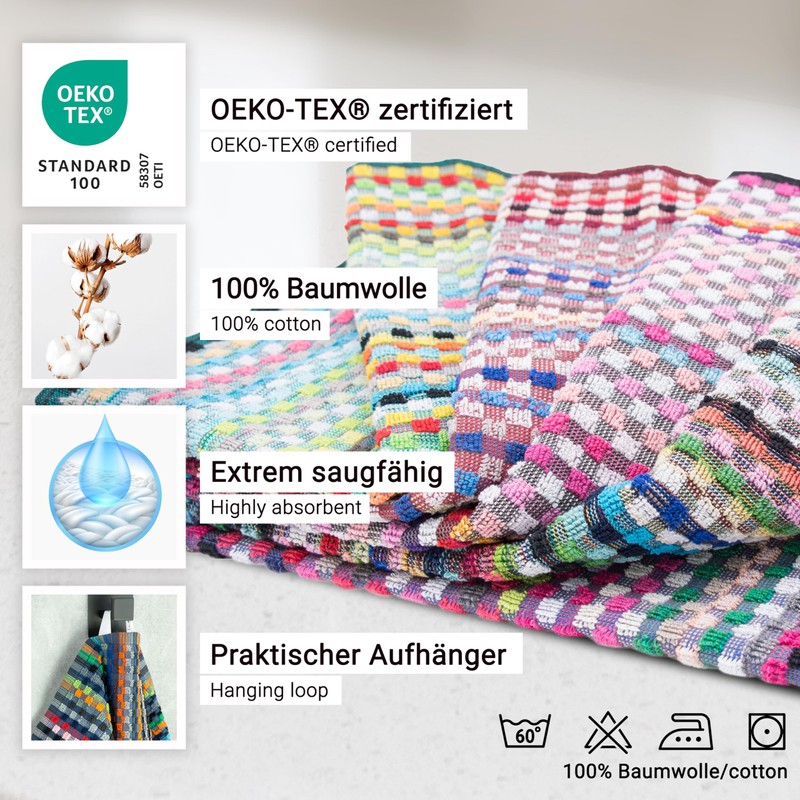 The robust kitchen towel in the size 45 x 90 cm hangs always at hand on the wall thanks to the hanger. A clean kitchen also includes hygienically clean dishcloths, so the drying cloths can be washed at 60°C and are suitable for tumble drying. The cotton tea towels have been dyed in a special process, which prevents colour loss. Of course, they are quality tea towels also tested for harmful substances according to Standard 100 by Oeko-Tex (R) – test number 58307 OETI.