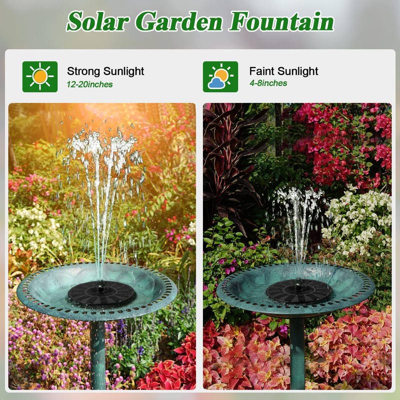 - Panel de vidrio de alta conversión cubierto: En comparación con el panel de plástico tradicional, nuestra fuente solar cubierta con vidrio 100%. Puede convertir la luz solar en electricidad de manera más eficiente y hacer que el spray de agua sea más estable y duradero. La altura de pulverización puede alcanzar 20 pulgadas en días soleados, añadiendo diversión y jengibre a tu jardín