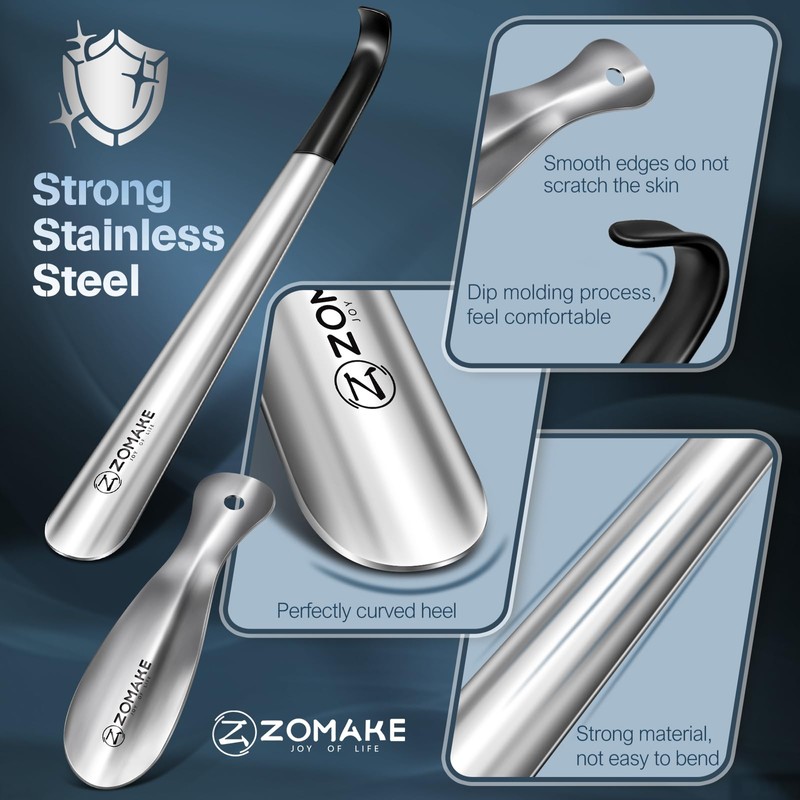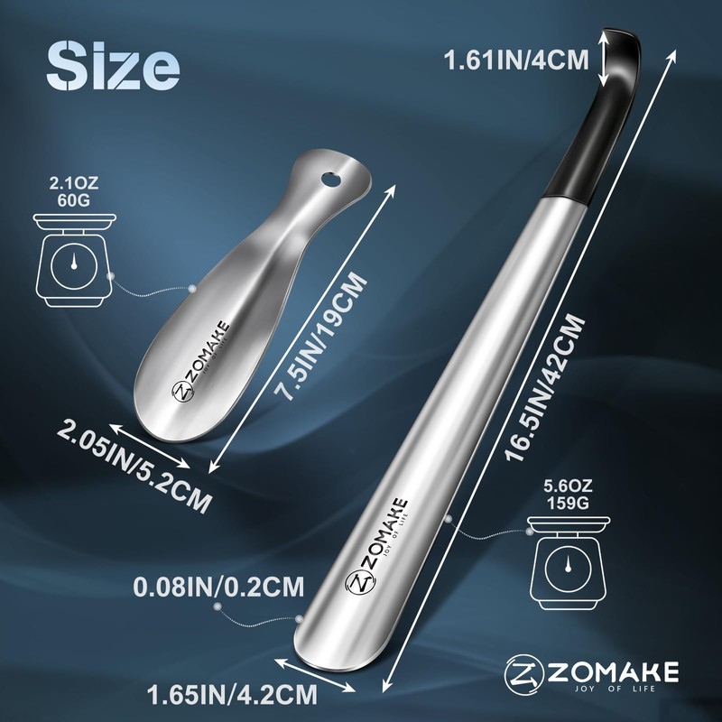 - LONG HANDLE SHOE HORN: ZOMAKE long handled shoe horn, 16.5 inches long, can penetrate deep into the shoe, providing greater leverage without bending over to wear. The long shoehorn can reduce bending or squatting movements for the elderly, pregnant women, or other people with limited mobility, metal shoehorn making it easier to put on and take off shoes and increasing the convenience of daily life