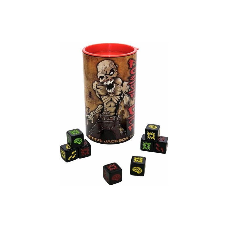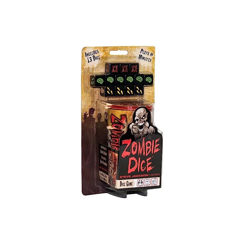 Zombie Dice is a quick game for any zombie fan (or the whole zombie family). The 13 custom dice are your victims. Push your luck to eat their brains, but stop before the shotgun blasts end your turn! Includes 13 custom dice and dice cup, to carry the game in. Fast to learn, games are 15 minutes or less to play.