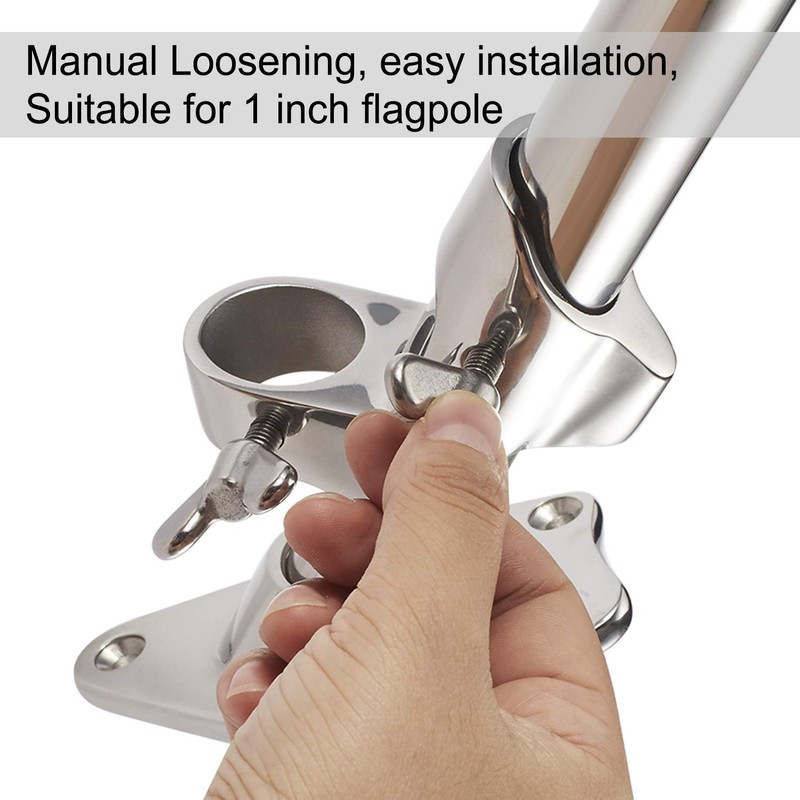 **Flag Pole Holder Specification** Material: 316 Marine Grade Stainless Steel Material Color: Silvery .Surface Polishing weight: 1.16lb / 525g **Installation Accessories Specification** Screws: Length 2.36in / 60mm Expansion screws: Length 2.36in / 60mm Bolts: Length 1.57in / 40mm Nuts : Diameter 0.3in /7.8mm **Installation Method** **✔** If you're mounting to **stone** / **concrete** / **masonry** , first mark the installation position of 3 holes with pen. And then drill a hole slightly longer than 60mm with 8mm (5/16”) diameter brill. Insert the expansion screw fully into the hole in the wall. Then align the three holes of the bracket with the installation position, and finally tighten the screw to fix the base with the cross screwdriver. **✔** If it is installed on the **wood material** , mark the installation position of 3 holes first, then align the flagpole base with the marked position. Finally, directly use a 5mm (3/16 ") diameter drill to drive the screws into the wall. **✔** If it is installed on the **RV** or **ship** , the screws or bolts can be selected for installation according to the actual situation.(Bolts+Nuts / Screws) **What will you get?** Flag Pole Holder x 1 Thumb screws x 2 Expansion screws x 3 Screws x 3 Bolts x 3 Nuts x 3 Installation instructions x 1 **Customer Service** Our aim is to provide Top Level Customer Service, and we are always standing by to solve any of your problems. If you have any question, please contact us via Message. All problems will be resolved.