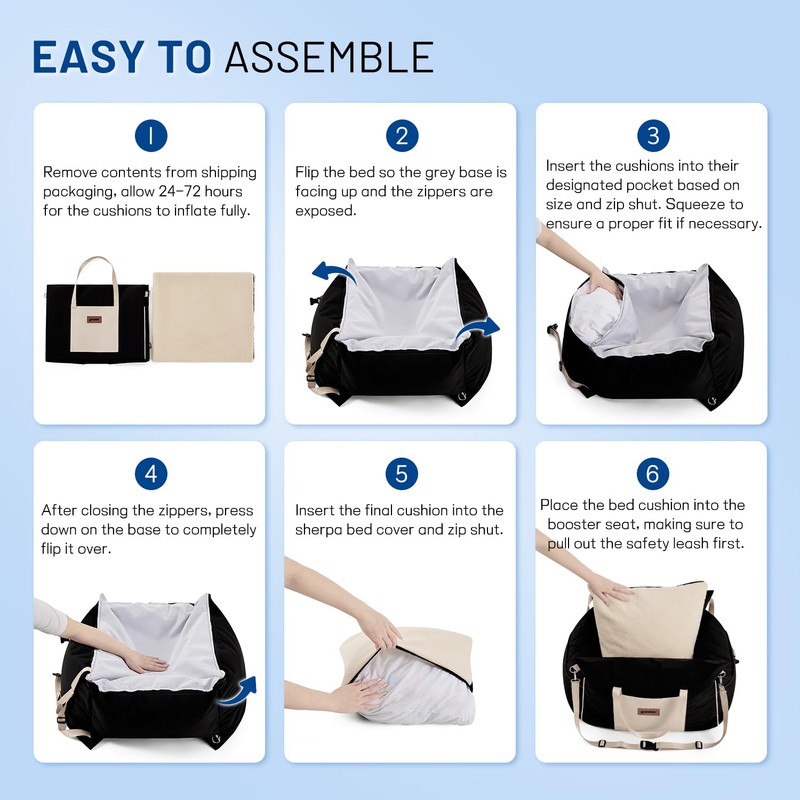 - Installation Tips: The outer shell and filling of the dog seat for car are packaged separately. Due to vacuum packaging, it may not be fluffy enough when first opened. Please pat the filling by hand and let it sit for 24 hours to allow it to expand. Follow the steps in the included instruction manual for assembly.