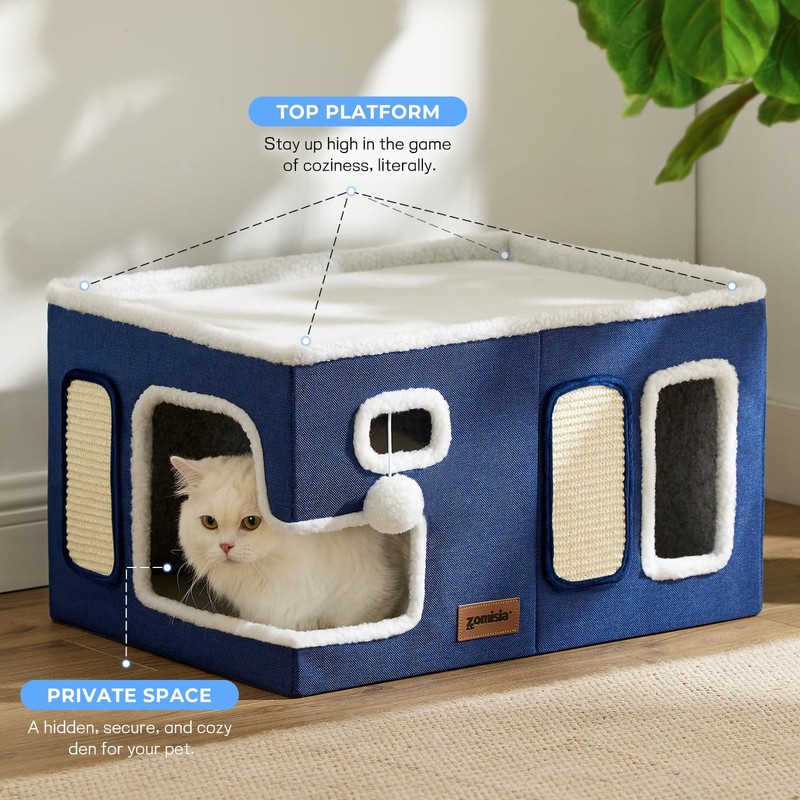 ZOMISIA Extra-Wide Cat House for Indoor Cats - Large Cat House for Pet with Fluffy Ball Hanging and Scratch Pad, Foldable Cat Hideaway for Multi Cats, 23x16.5x13 inches, Grey