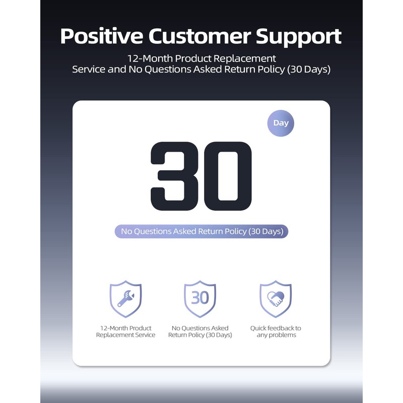 - 24-hour Product Support - Our products come with an exchange guarantee within 30 days and an additional 12 months of Replacement Support.