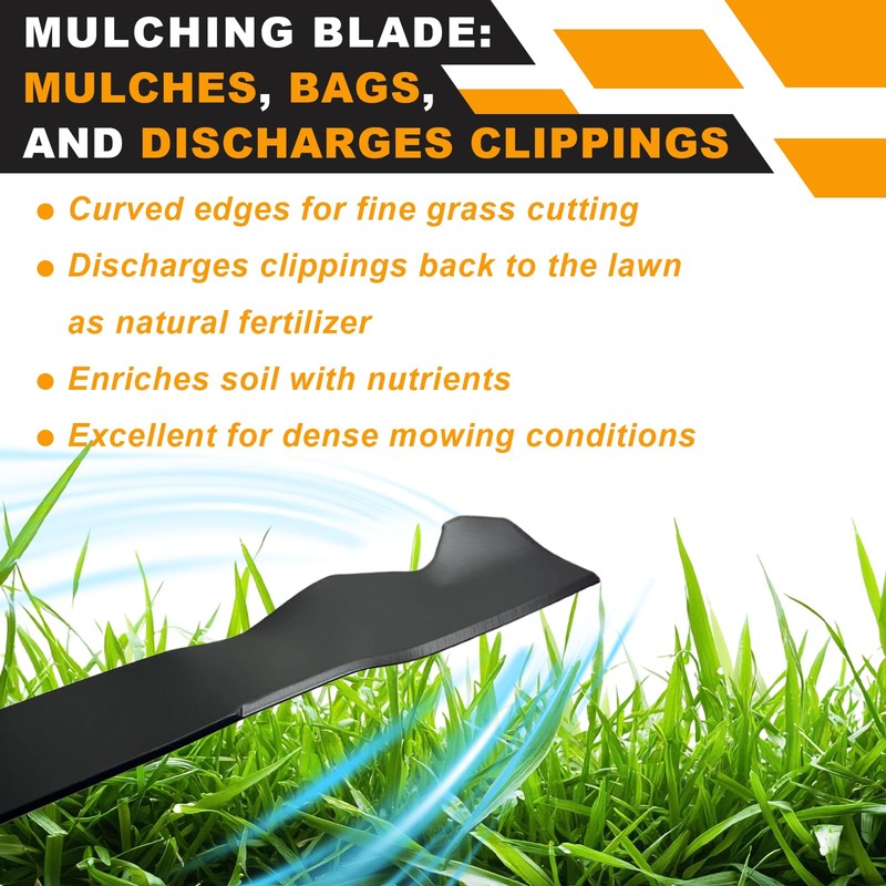 - [21" Mulching Blade]:This 21 inch Hyper Tough blade is deal for cutting tall grass and dense vegetation in your yard. The blade's Curved edges for fine grass cutting, discharges clippings back to the lawn as natural fertilizer.Excellent for dense mowing conditions