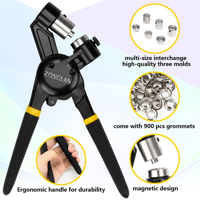 zonglan Heavy Duty Grommet Tool Kit of 1/2" 5/16" and 3/8",Multi Size Handheld Eyelet Tool Plier Rivet Press with 900 pcs Silver Grommets for Tarp Leather Fabric