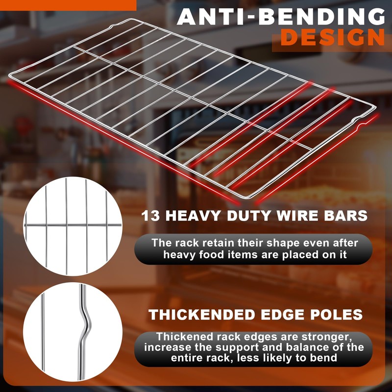 - Versatile Kitchen Essential: applied for roasting, baking, and broiling, these oven racks help elevate food for crispier results; The sturdy material withstands frequent use without warping or discoloration, making them suitable for both home kitchens and small bakeries