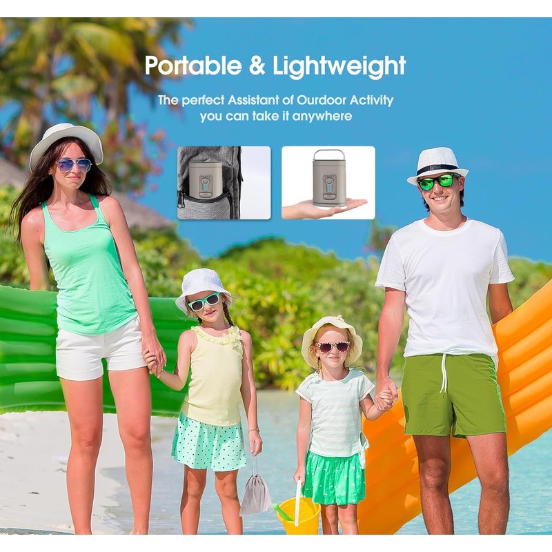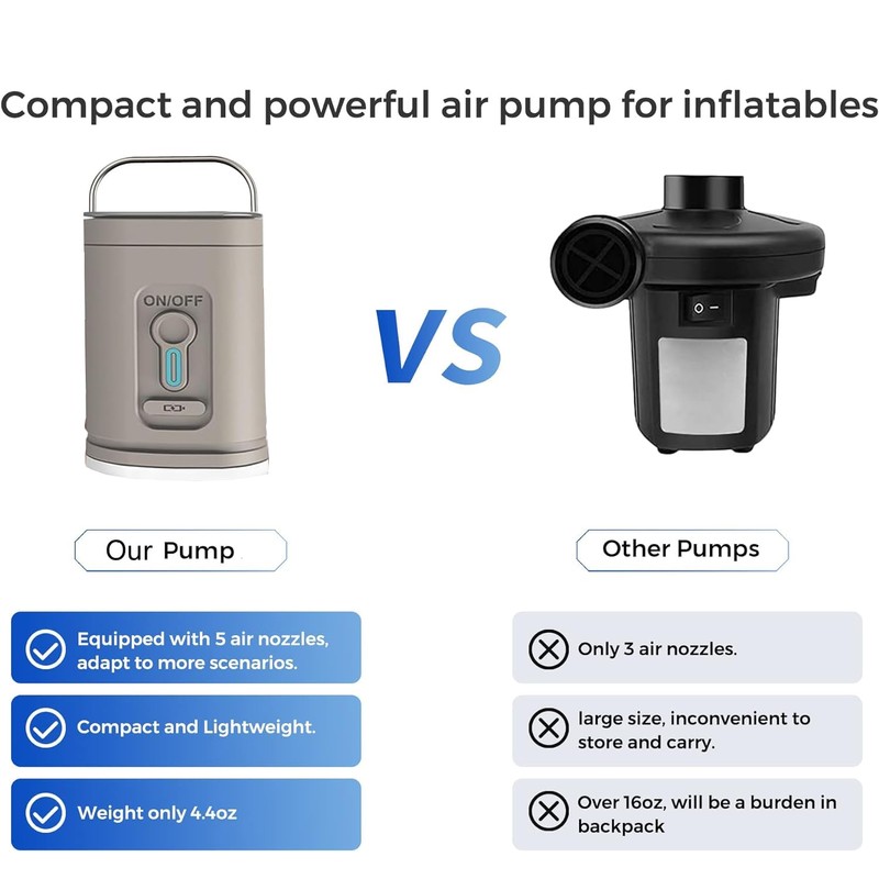 - Air pump electric air mattress pump: compact and lightweight and portable: our portable air pumps with a weight of only 135 g, is about as large as a palm, which is ultra-light and compact to save space and carry, so that inflation pump easy to hold, and offer convenience in indoor and outdoor occasions. You can easily pack USB pumps in the storage bag and hang wireless air pump on your backpack or it fits well in your carried package and travel suitcase