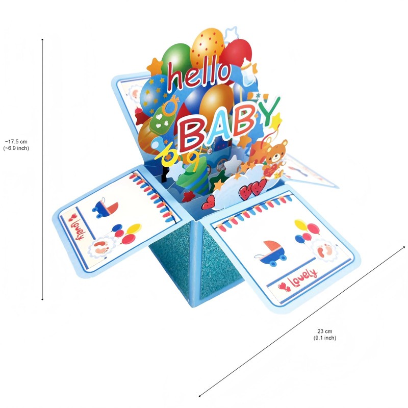 - BABY BIRTHDAY CARD: Opening the 3D birthday card displays a cute "Hello Baby " with nice balloons and creates a lovely atmosphere