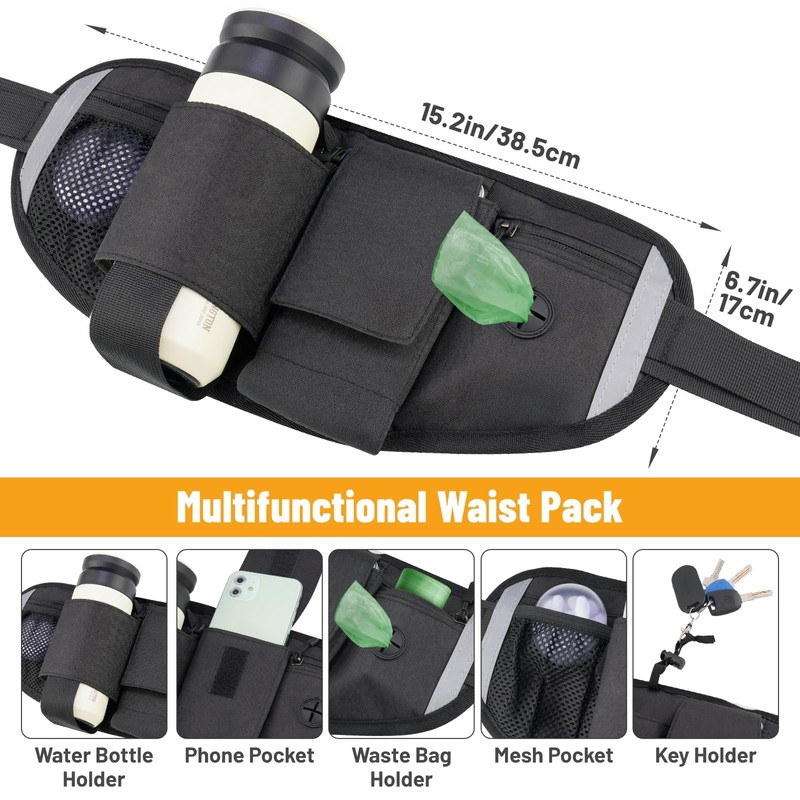 - Poop bag distributor and snack rack: The poop bag distributor effectively distributes one poop bag at a time, and there is enough space in the pocket to carry a roll of poop bag, so you don't have to worry about running out while walking. These two pockets can be taken out of the waistband for individual use.