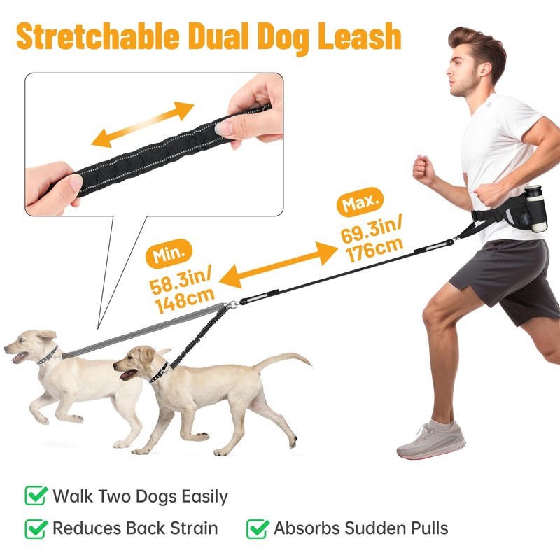ZooZoo Hands-Free Double Dog Leash for Running, Walking, Jogging, Secure Belt with Multiple Pockets for Phone, Wallet, Retractable Dual Bungee Ropes for Two Dogs, Reflective Belt & Poop Bag Dispenser