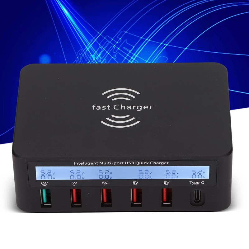 Zopsc Bloque Estación Carga USB para Teléfono 40W 6 Puertos QC 3.0 Hub Base de Carga Inalámbrica con LCD Dispaly 100-240V Negro