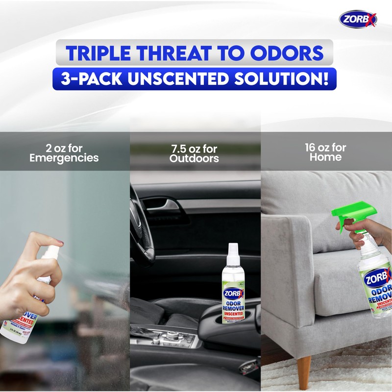 - CONVENIENT USAGE: ZORBX Value Pack has three odor remover sprays in different quantities (16 Oz, 7.5 Oz, and free 2 Oz.). The bigger odor remover spray bottle (16 Oz) can be used to handle tough odors at home, garage, and bathrooms. While the compact-sized odor remover spray bottle (7.5 oz.) can be kept in your car, gym locker, or office to get rid of bad odors instantly. While the travel-friendly odor remover spray (2 Oz) can easily be carried anywhere in your purse or handbag.